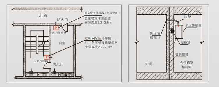 2、對于樓梯間,由于余壓控制區域為一個空間且上下貫通,余壓傳感器僅在整個建筑樓梯間高度的1/3處安裝一個,余壓傳感器的探測點一側設于樓梯間,另一側設于走道,余壓設定值為40-50pa,當系統控制區域超壓時,系統聯動控制泄壓閥執行器,根據實際余壓值與設定值的差異調節泄壓閥,以保證前室正壓為設定值。