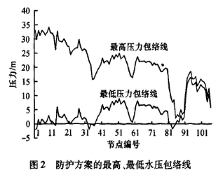在節點設置復合式排氣閥后,系統發生停泵水錘時輸水管最高、最低壓力見表2,最高、最低壓力包絡線見圖2。